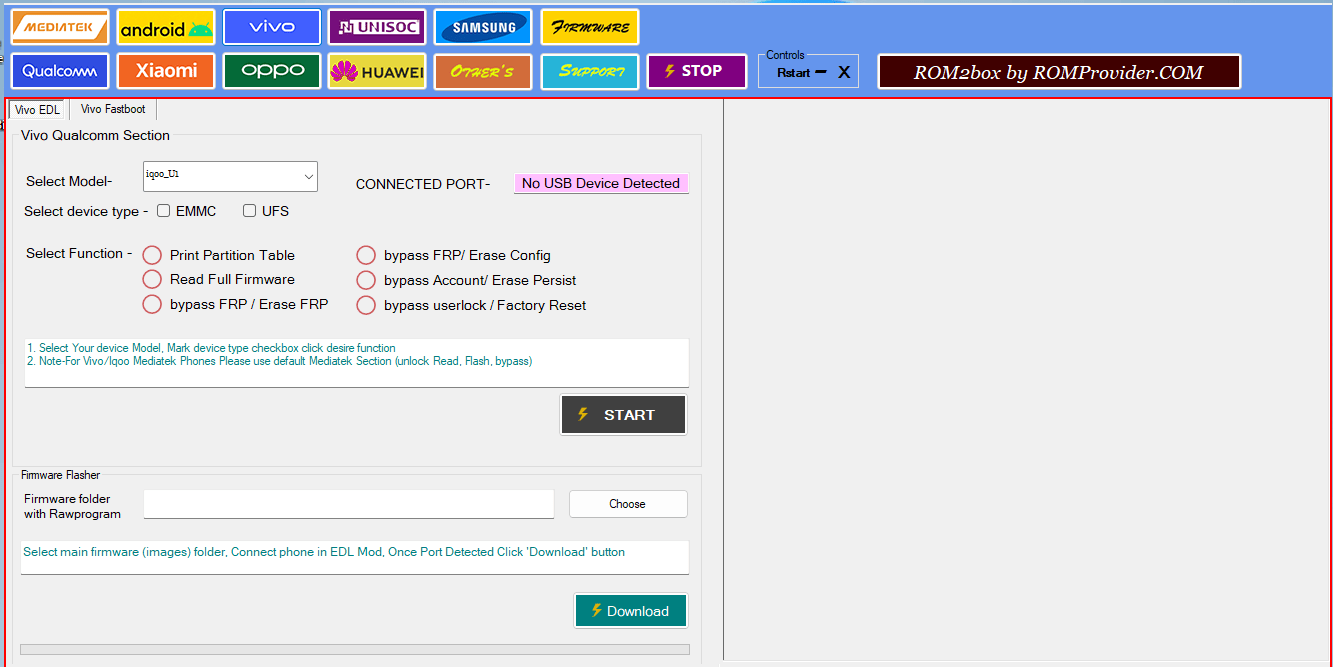 ROM2Box software is a free smartphone repair program created by ROMProvider.COM. The tool supports QCOM, Mediatek and spreadtrum smartphones. This includes many Download Disabled Smartphones from Oppo. Vivo. Xiaomi.