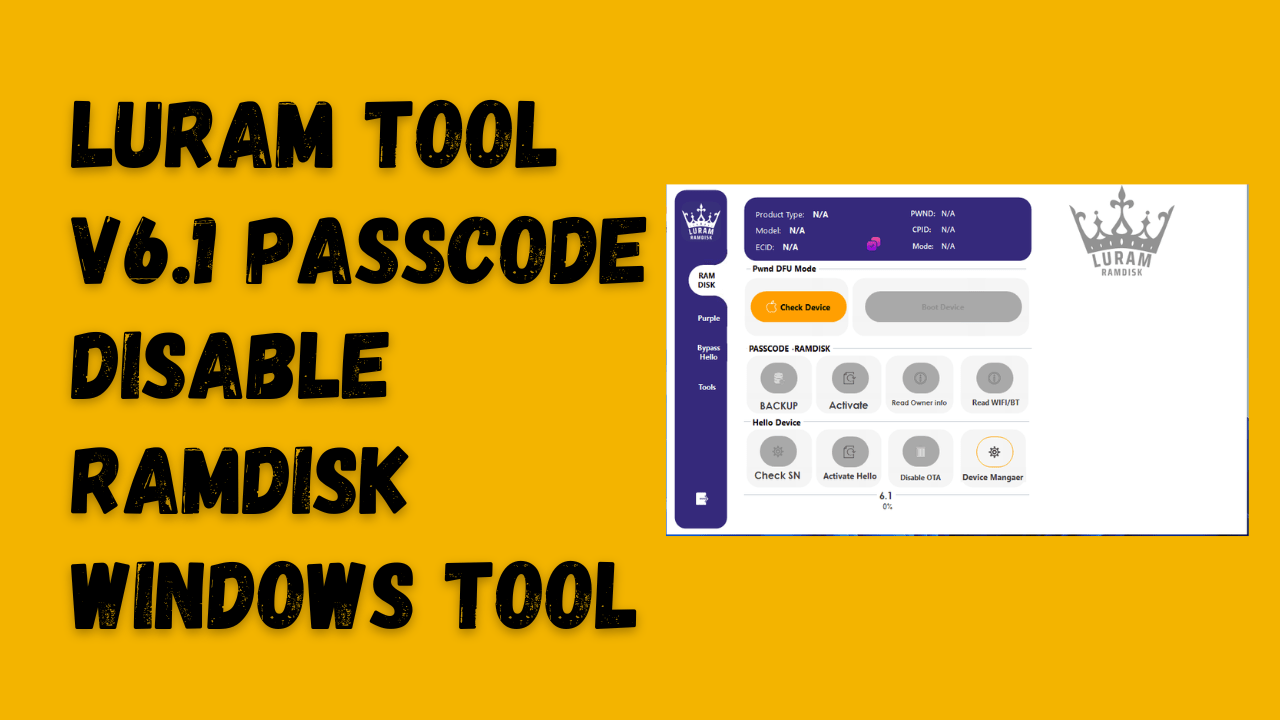 The LURam Tool v6.1 is a Passcode Disable Ramdisk Windows Tool. It can use to disable the passcode feature on a Windows device. This tool can be used to bypass the passcode on a locked device or to remove the passcode from a device that has been locked out.
